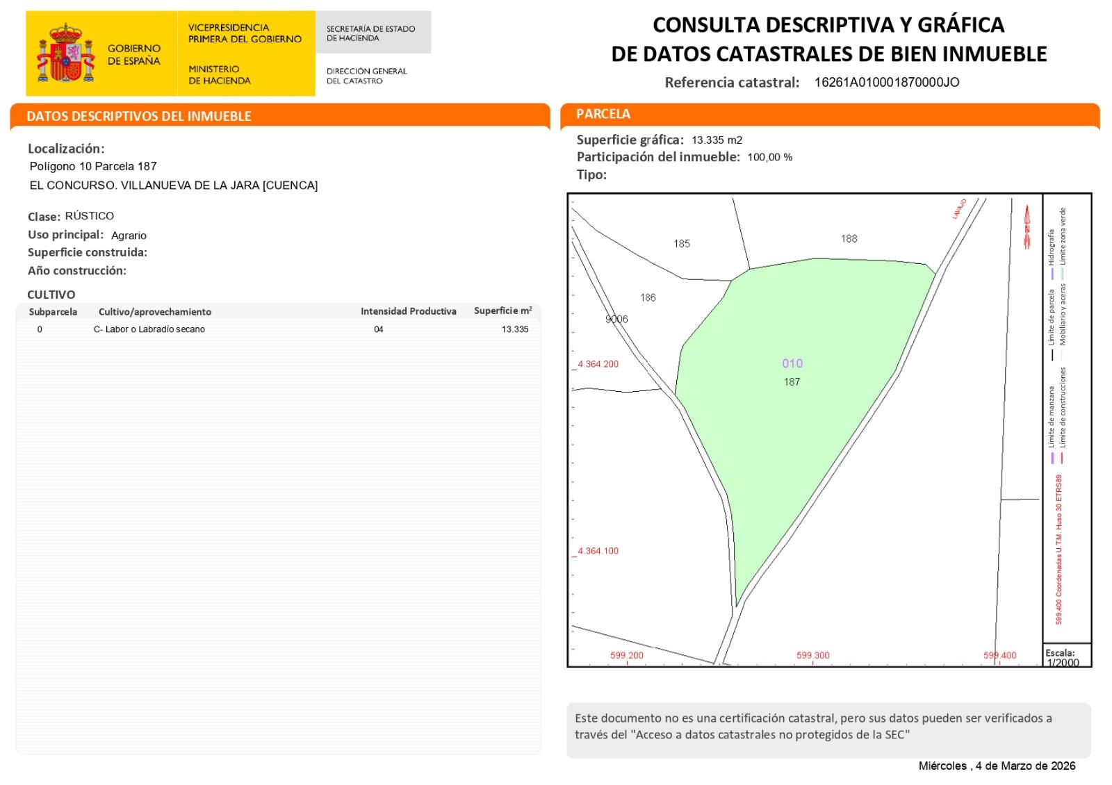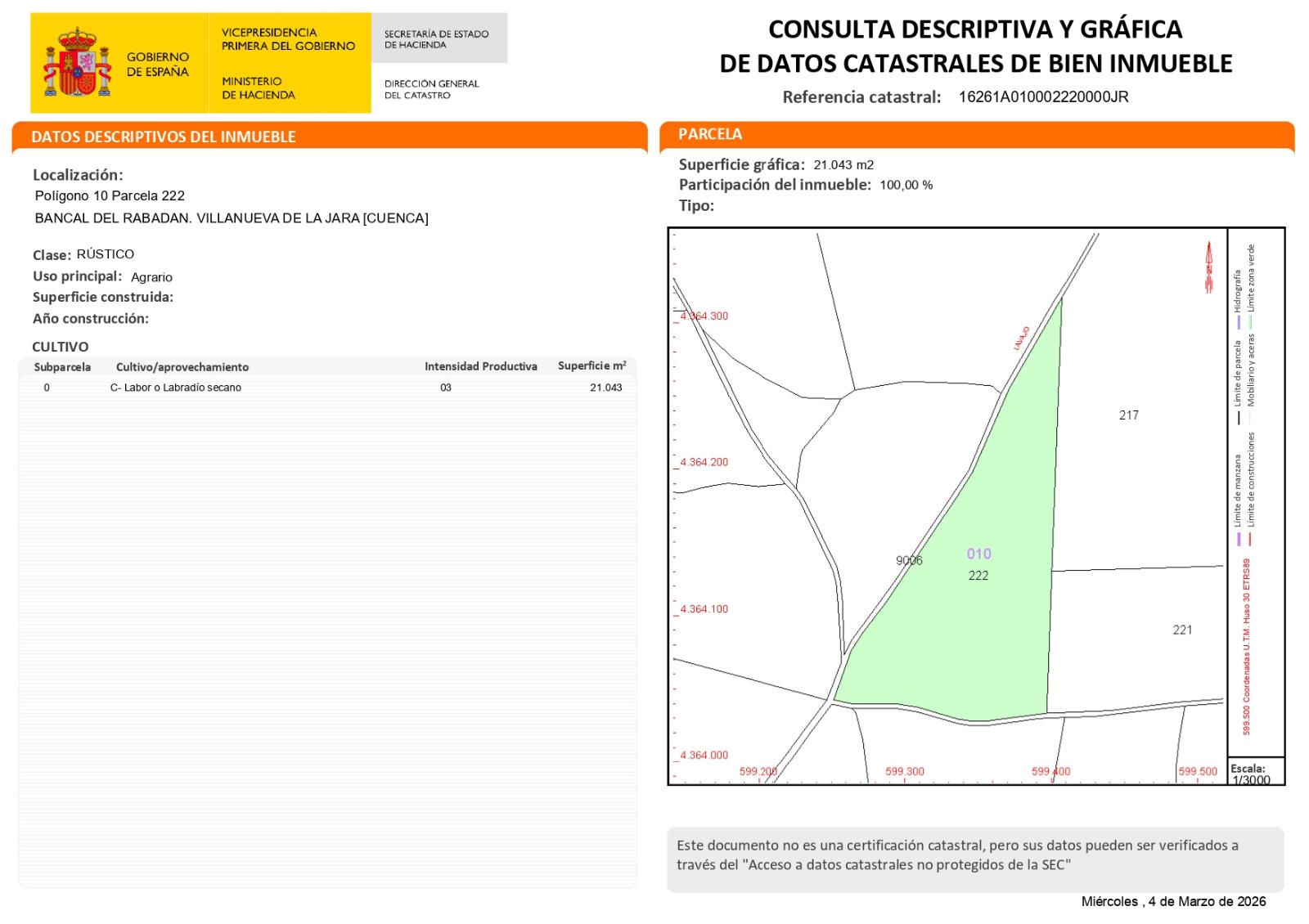 Se vende **parcela rústica de 35.780 m²**, destinada al **cultivo de cereal de secano**, ubicada en el término municipal de **Villanueva de la Jara**, a unos **2,5 km de la pedanía de Casas de Santa Cruz**.