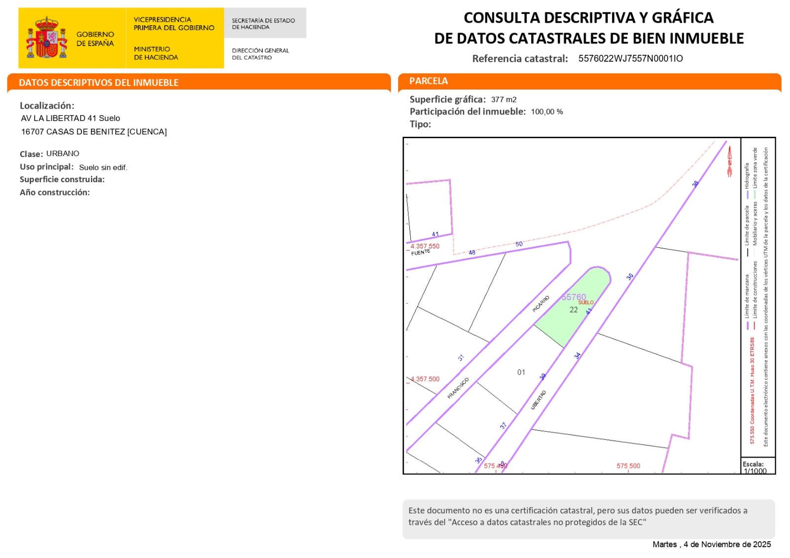 🏡 Votre avenir commence ici ! Belle opportunité à Casas de Benítez. Vous rêvez de concevoir et de construire la maison de vos rêves, entièrement personnalisée ? Voici l'opportunité que vous attendiez ! Nous vous proposons un magnifique terrain constructible de 377 m² situé dans la ville calme et bien desservie de Casas de Benítez (Cuenca). Fini les mauvaises surprises et les problèmes d'accès ! Ce terrain se trouve dans une zone entièrement urbanisée, garantissant un investissement sûr et une construction immédiate. Emplacement, accessibilité et services exceptionnels. Profitez du confort d'avoir tous les services essentiels à portée de main : Accès goudronné : entrée et sortie faciles, réduisant les coûts de construction. Éclairage public : sécurité et qualité de vie garanties dès le premier jour. Raccordements aux réseaux : le terrain offre un raccordement immédiat à l'électricité et à l'eau, accélérant la construction de votre maison. Mais ce qui rend ce bien vraiment exceptionnel, c'est son caractère unique : il bénéficie d'une façade sur TROIS RUES. Cette triple orientation offre une liberté de conception exceptionnelle et une luminosité naturelle incomparable pour votre future maison, ainsi qu'une grande flexibilité pour l'aménagement des allées et des jardins. 377 m² pour construire le projet de vos rêves. Idéal pour une villa, une maison individuelle ou tout autre type d'habitation. Ne manquez pas cette opportunité de vivre où et comme vous le souhaitez ! Prix et conditions imbattables. Appelez-nous dès maintenant pour une visite sans engagement. Construisez votre avenir dès aujourd'hui !